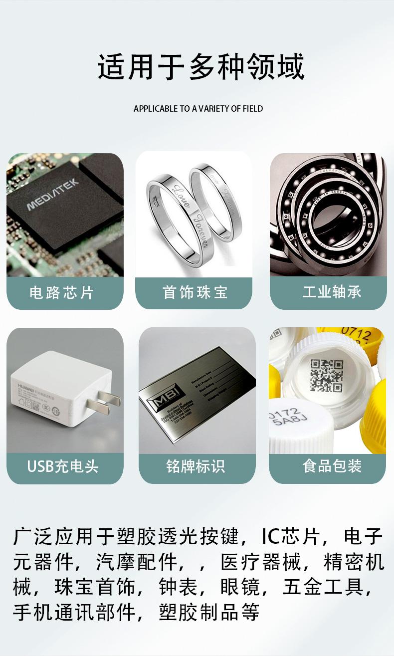 Applicable industries: for integrated circuit chips, electronics, electrical components, industrial bearings, clocks, communication products, aerospace devices, various auto parts, home appliances, hardware tools, molds, building materials, wire and cable, food packaging, jewelry, tobacco As well as the marking of graphics and text in many fields such as military, as well as high-volume production line operations.